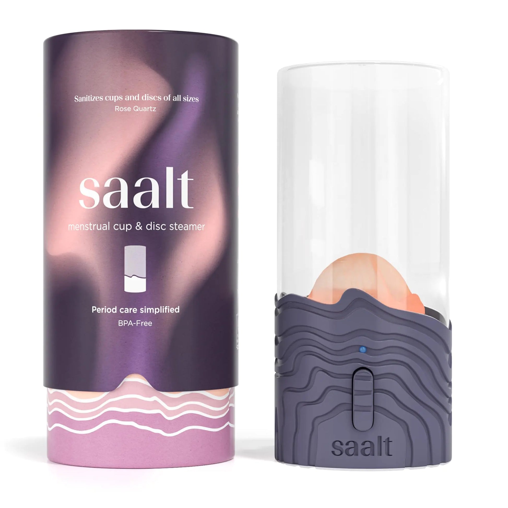 The Saalt Steamer makes cleaning your menstrual cup or disc quick, safe, and hassle-free. At the touch of a button, it steam-sterilizes your reusable period care in minutes—just add water, press start, and let it do the work. As effective as boiling but far more convenient, the steamer heats water to 212–240°F for a squeaky-clean cup or disc every time. Custom-designed in the USA with an elegant, compact design, it’s discreet enough for your counter and portable for travel or co-living spaces. Safe for all silicone and TPE cups and discs, the Saalt Steamer is a sustainable essential for modern period care. Plus, with every purchase, Saalt donates 2% to menstrual health, girls’ education, and sustainability worldwide.